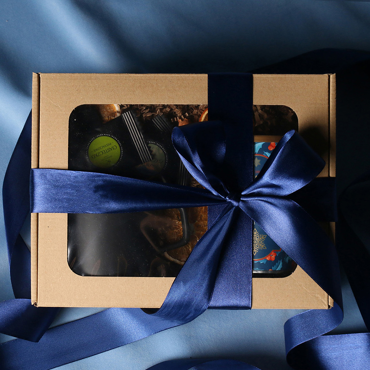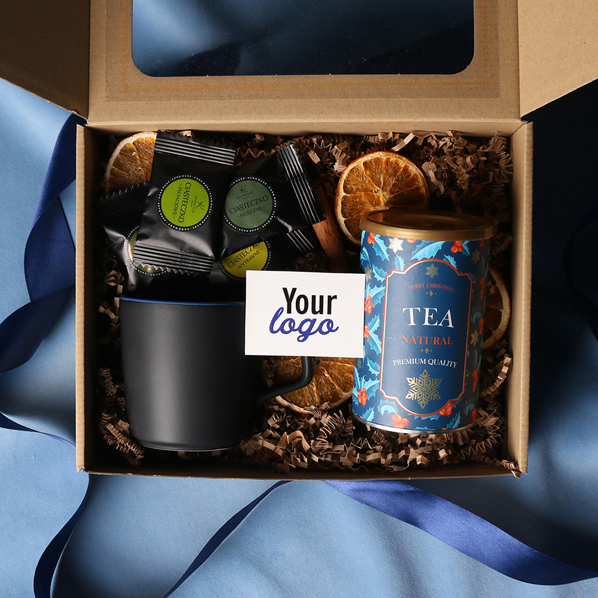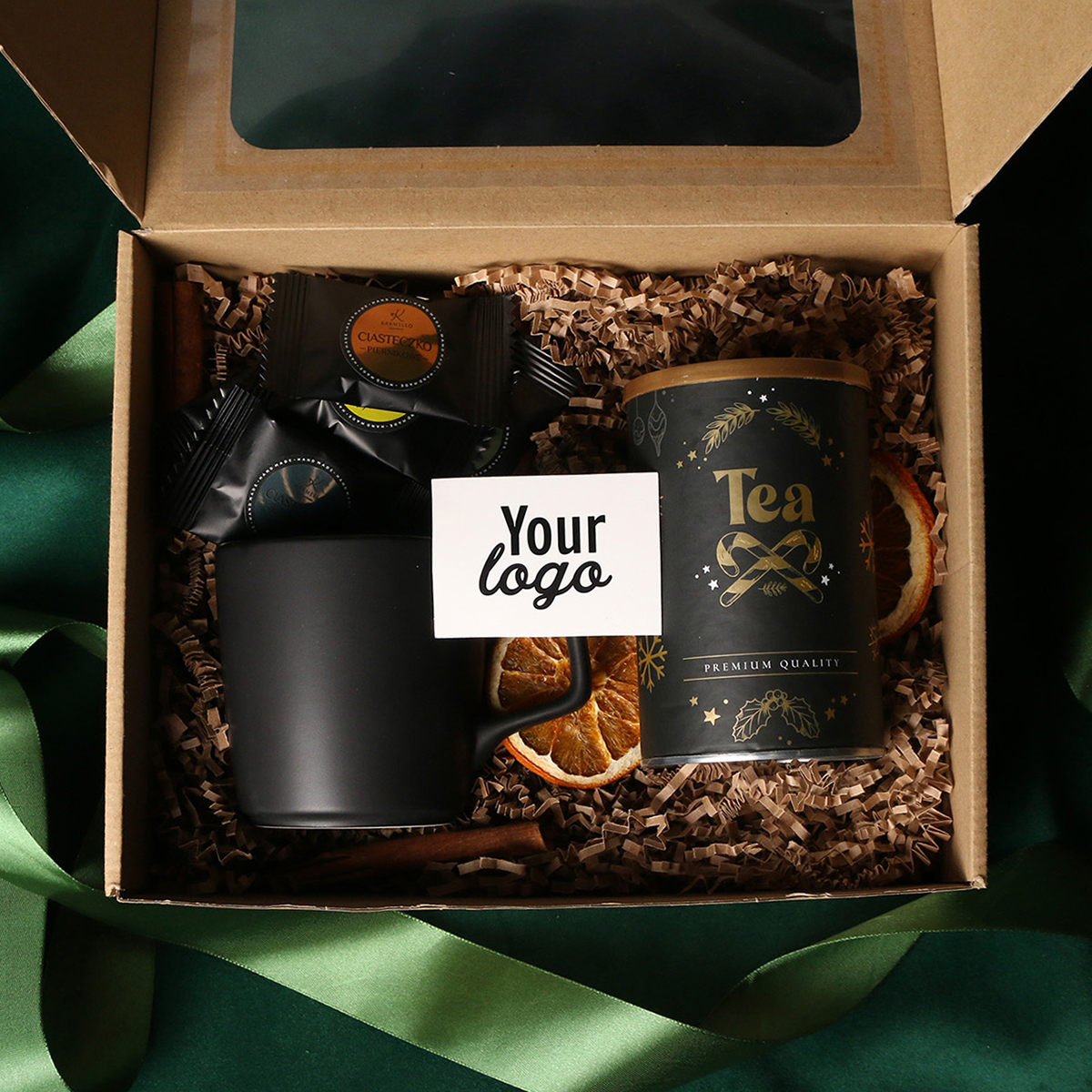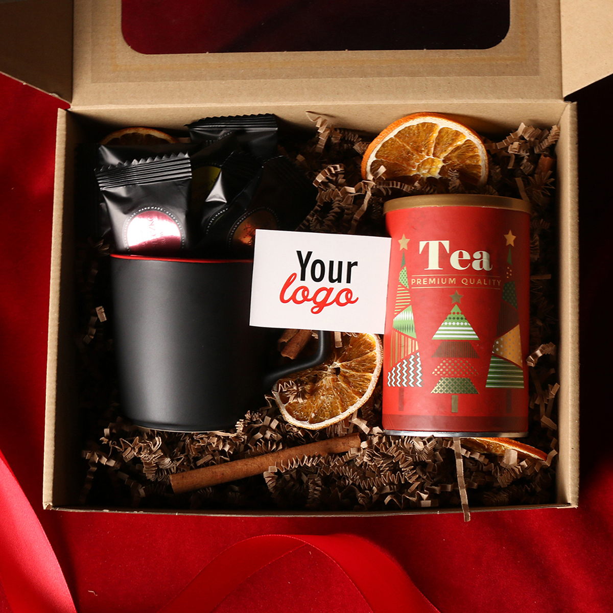 W skład zestawu wchodzą: kubek Barrel Supreme czarno-czwrwony / czarny-reflex blue / czarny-czarny z możliwością zdobienia, zielona herbata Sencha z wiśniami, płatkami róży zapakowana w tubę z motywem zimowym, 8 sztuk czekoladek / ciasteczek - mix smaków. Całość w stylowym opakowaniu z tektury eco z okienkiem. Opcje dodatkowej customizacji: nadruk na kubku, bilecik z logo firmy, wstążka lub obwoluta z motywem zimowym wzbogacona złoceniem.