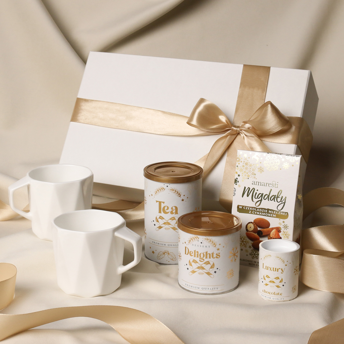 Ekskluzywne kubki z porcelany Fine Bone China - Crown - 2 szt. Słodkie migdały w czekoladzie z cynamonem Delikatne Delights Pralines - czarna porzeczka w białej czekoladzie w pudrze malinowym 80g Aromatyczna herbata zielona Sencha z wiśniami, płatkami róży i liśćmi ginko biloba 80g Ekskluzywne opakowanie zamykane na magnes z możliwością dodania pasującej wstążki i obwoluty